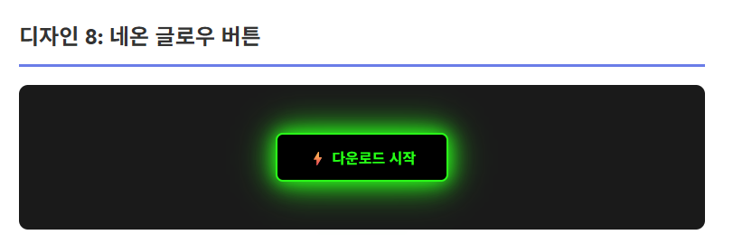 <a href="버튼 클릭시 이동 URL" target="_blank" style="display: inline-block; padding: 13px 34px; background-color: #000000; color: #00ff00 !important; text-decoration: none !important; border: 2px solid #00ff00; border-radius: 8px; font-weight: bold; text-align: center; box-shadow: 0 0 20px #00ff00, 0 0 40px #00ff00; transition: all 0.3s;">⚡ 다운로드 시작</a>